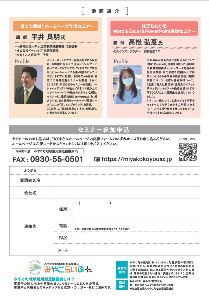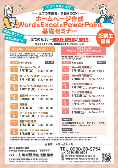 2月から3月まで毎週 福岡県京都郡みやこ町にてホームページ作成セミナーを行います。