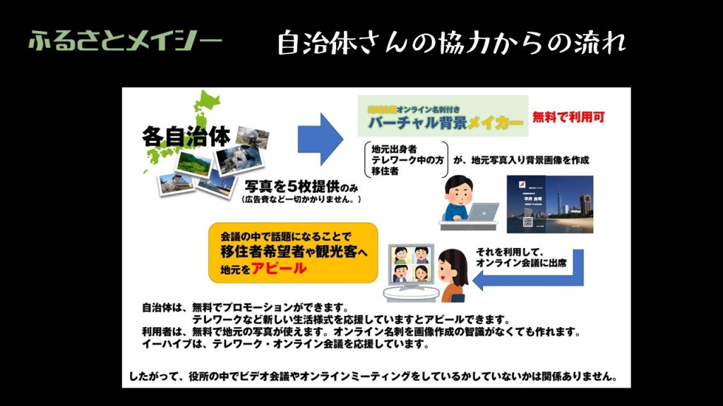 を受け、イーハイブでできることを考え、提供をはじめました。全国の自治体さんに地域の写真(景色や名所・名産品)を協力いただき、バーチャル背景に利用できるようになりました。革新ビジネスアワード2020でビジネス部門優秀賞も受賞したサービです。