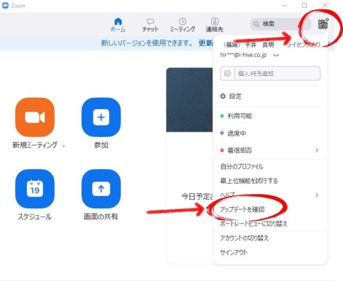 その場合は、、Zoom画面右上のユーザーアイコンから「アップデートを確認」を選択します。