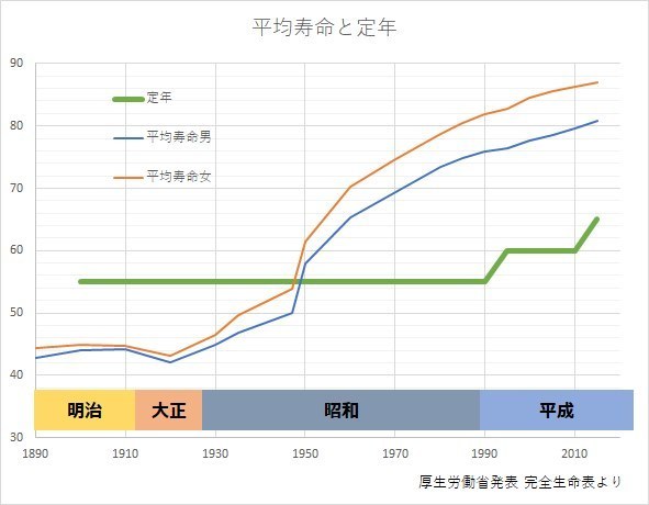 平均寿命が30年以上伸びているのに、定年の年齢は、10歳しか伸びてないのです。