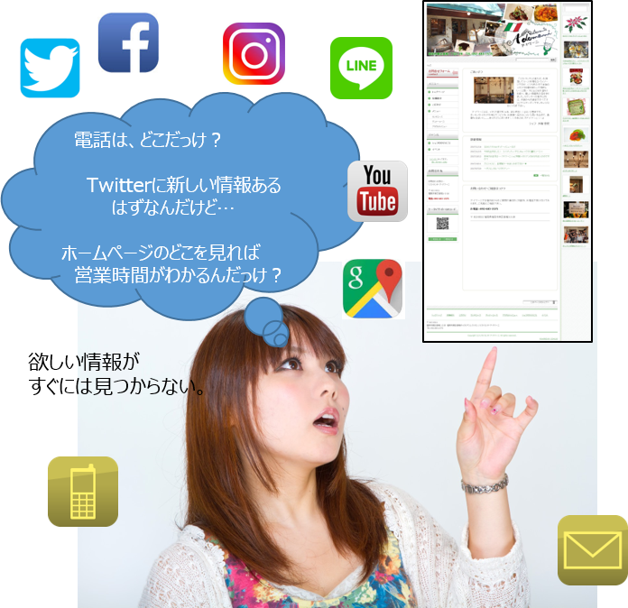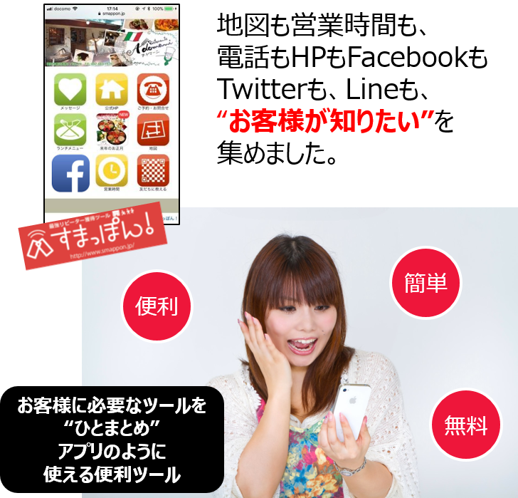 地図も営業時間も、電話もHPもFacebookもTwitterも、Lineも、 ”ひとまとめ”にしました。スマーフとフォンの中に、お店のアイコンを置いてもらえると、“お客様が知りたい”をいつでも提供できます。