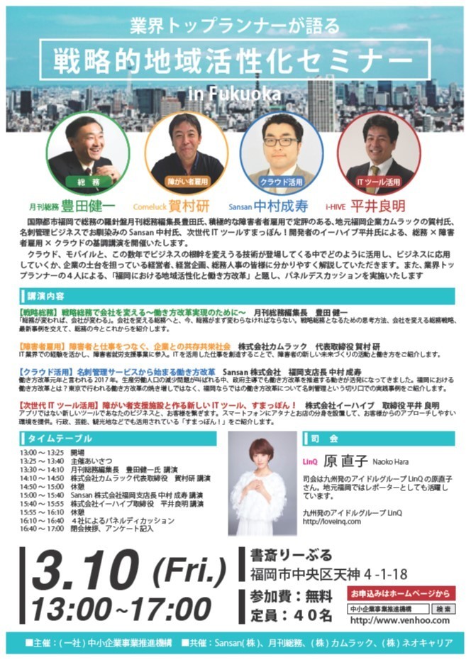 国際都市福岡で総務の羅針盤月刊総務編集長豊田氏、積極的な障害者者雇用で定評のある、地元福岡企業カムラックの賀村氏、名刺管理ビジネスでお馴染みのSansan中村氏、次世代ITツールすまっぽん!開発者のイーハイブ平井氏による、総務×障害者雇用×クラウドの基調講演を開催いたします。