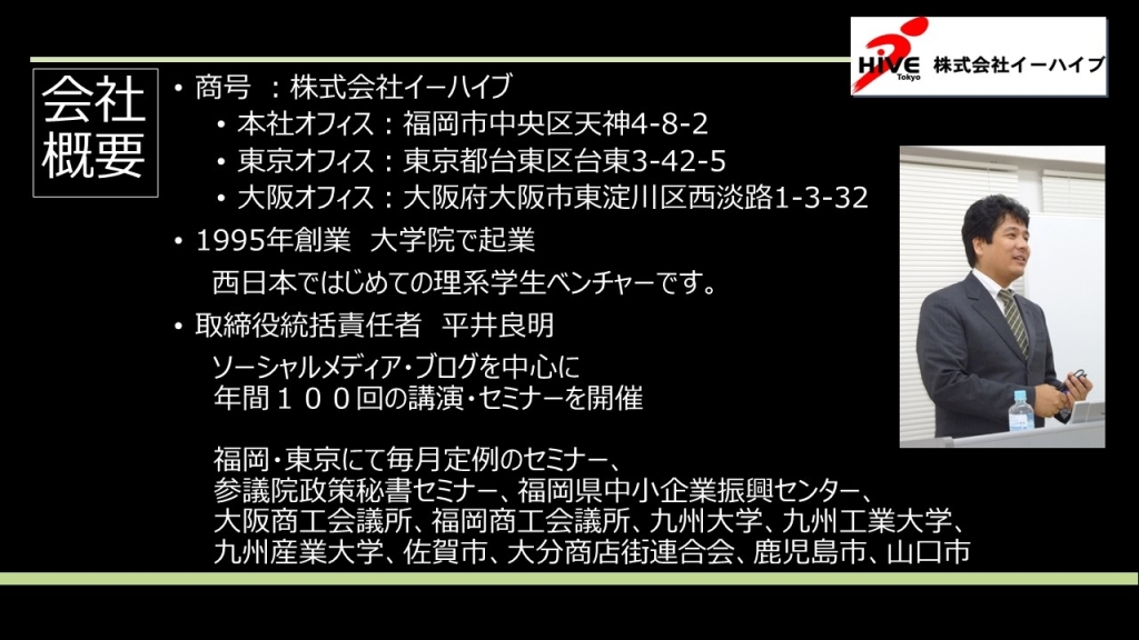 株式会社イーハイブは、東京・大阪・福岡にオフィスを置き、1995年に九州工業大学の大学院生が起業した会社です。当寺ようやくWindows95がでてきて、インターネットが普及し始めようかというときです。そのころから、ホームページやWEBアプリケーションを中心に開発してきました。