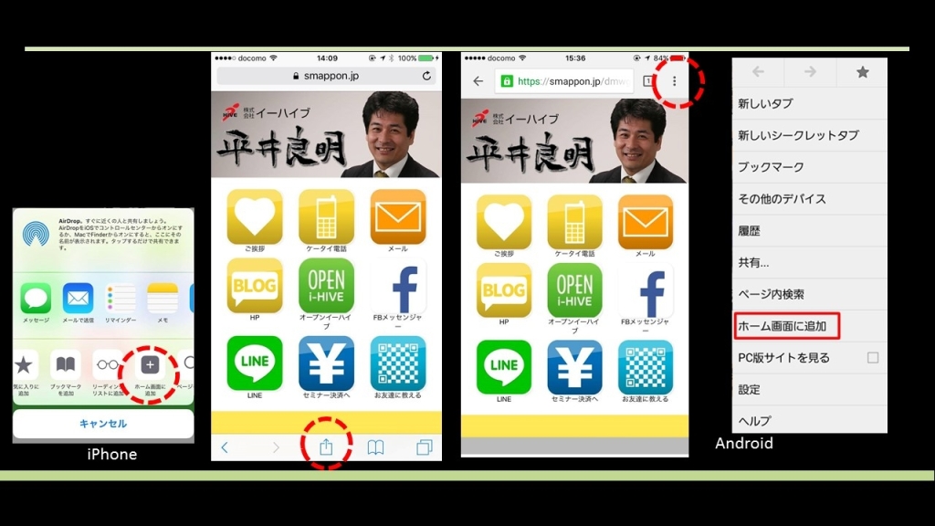 ■Chromeの場合は、右上のメニューを押して 「ホーム画面に追加」を押してください。