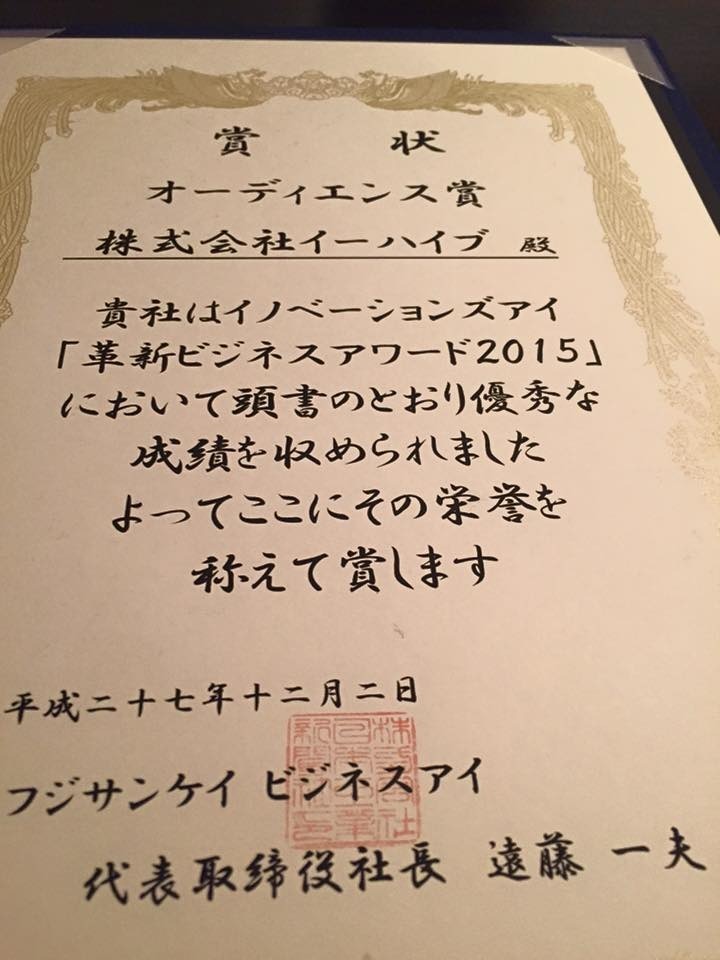 革新ビジネスアワード2015でオーディエンス賞をいただくことができました。