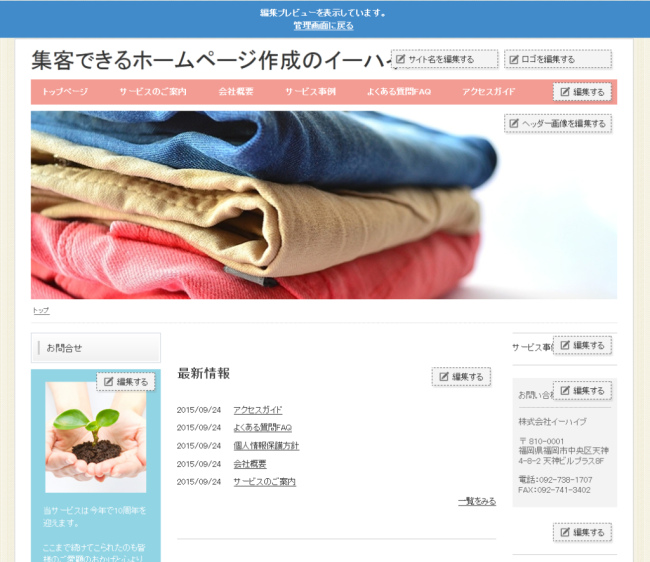 現在のホームページを見ながら主要な編集エリアを編集できる機能です。