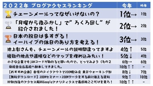 2022年は、ランキング表にしました。 リンク先は、こちらです。1.チェーンメールってなぜいけないの? 2.「月曜から夜ふかし」で”ろくろ回し”が紹介されました! 3.日本の祝日は多すぎる!イーハイブの休日のあり方を考える! 4.池上...